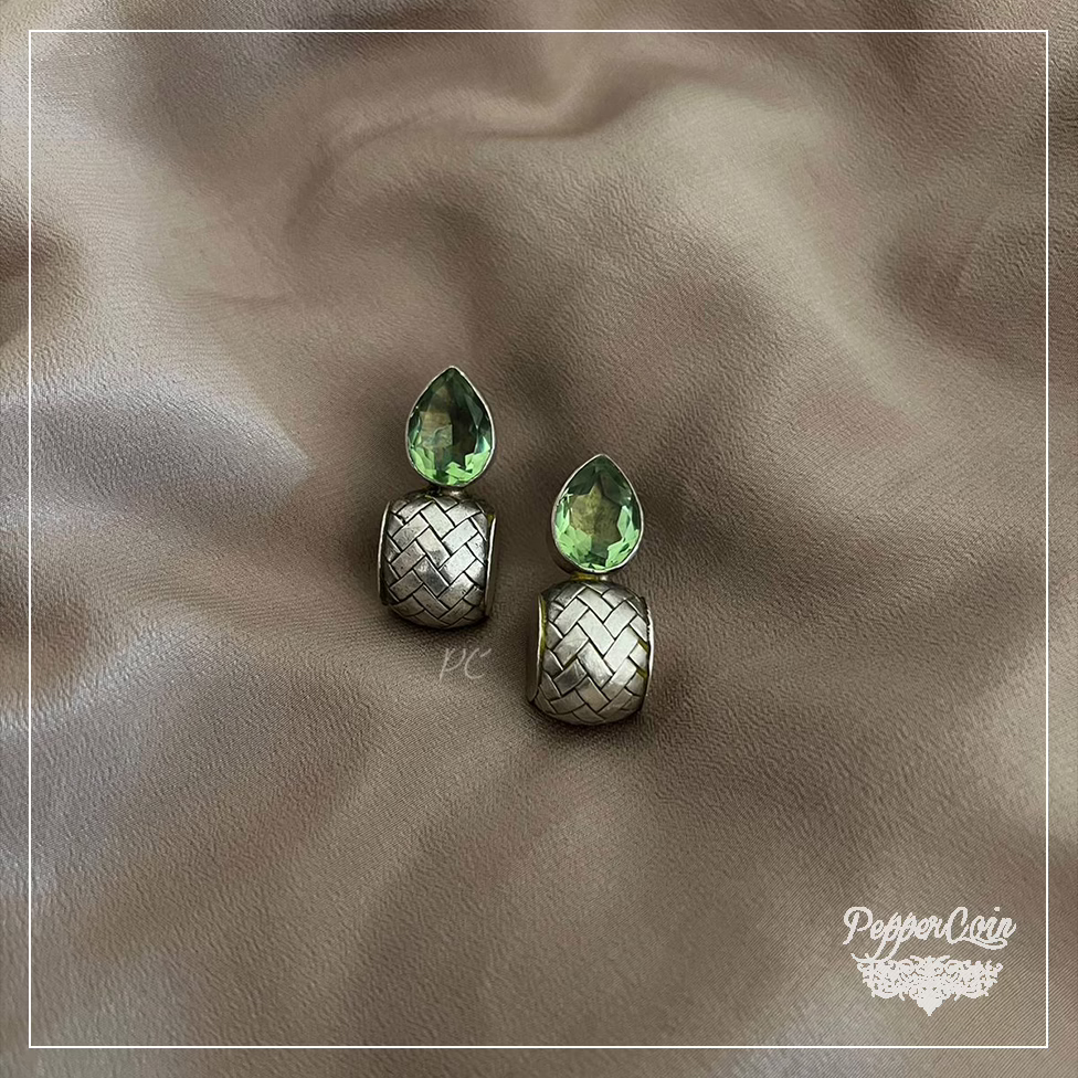 Contemporary Silver earrings Handcrafted Weave patterned with peridot stone.