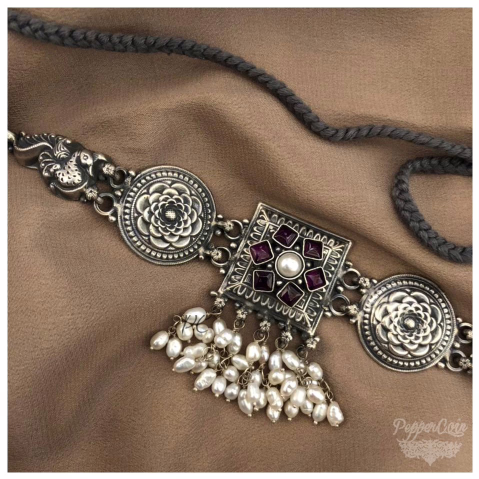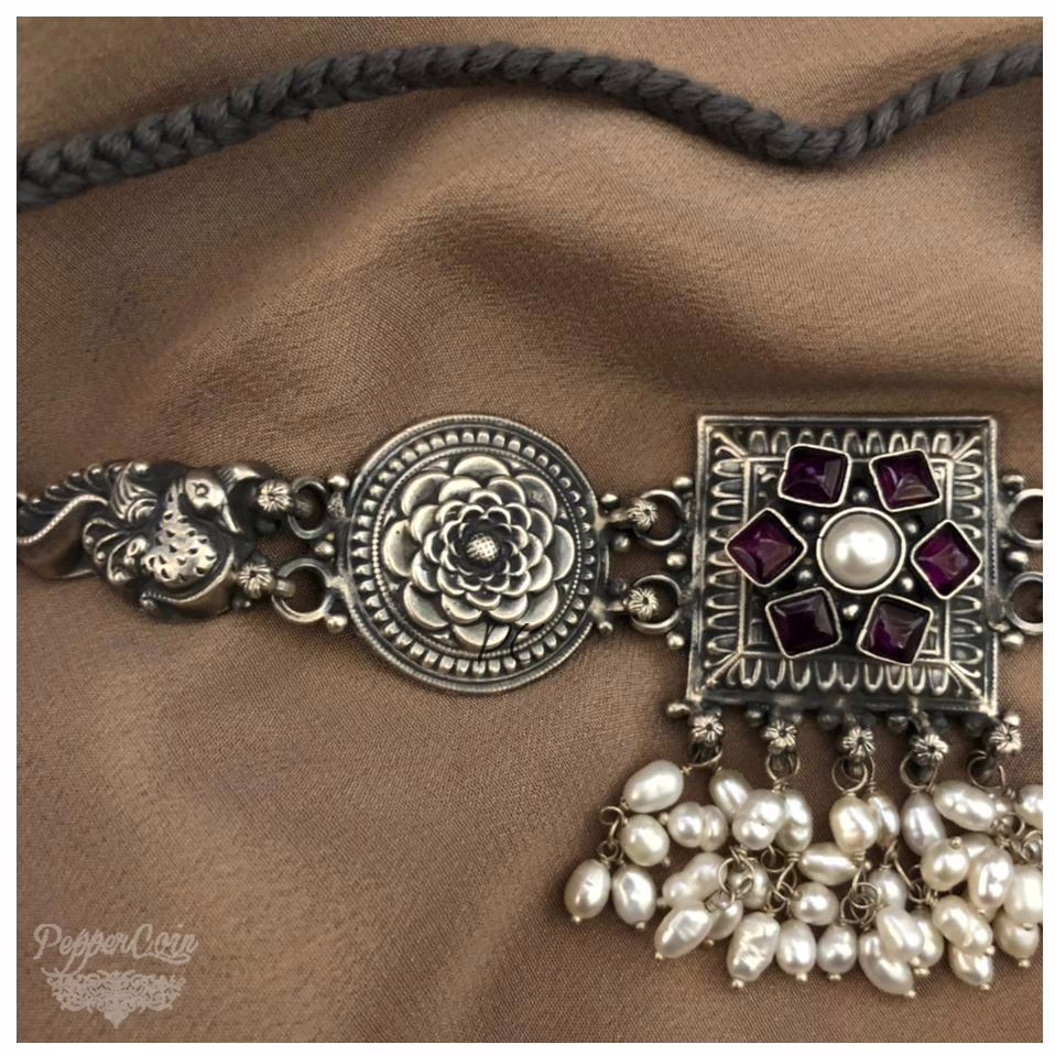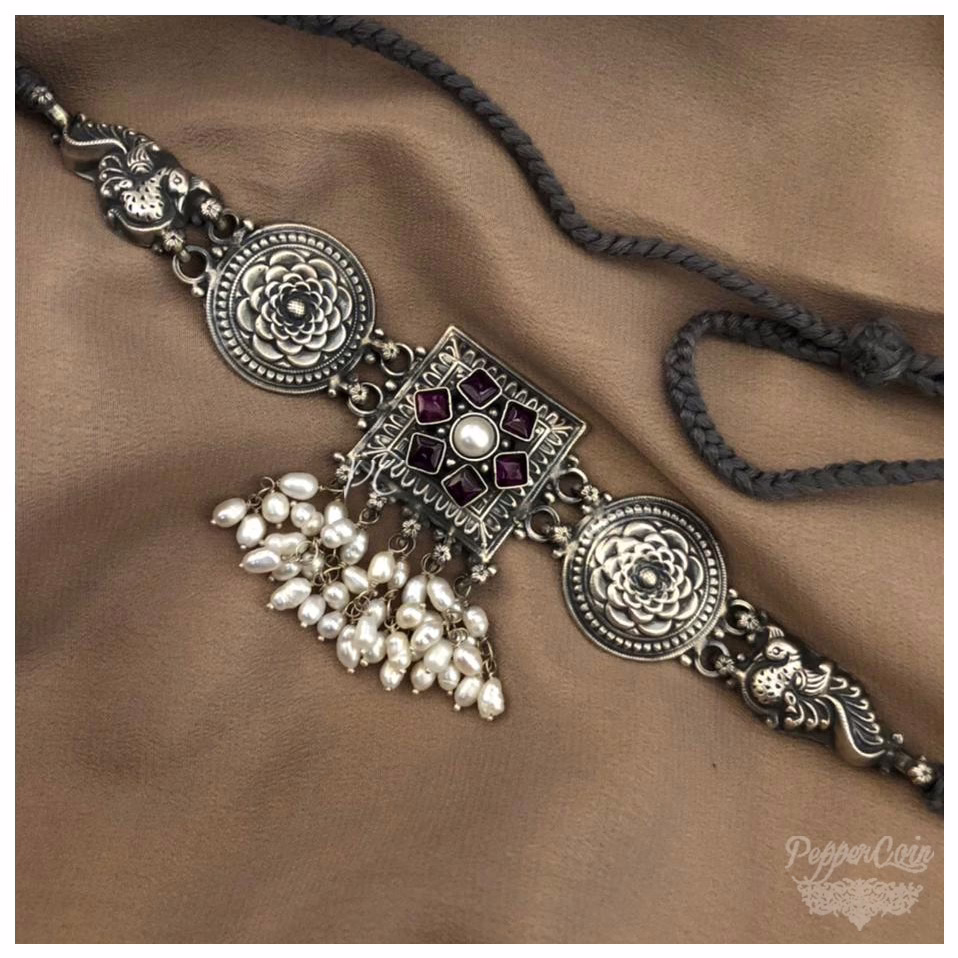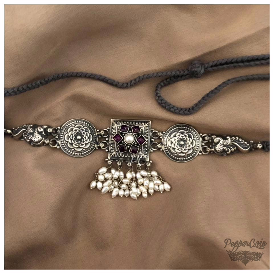 Silver Choker with Kemp stone and fresh water pearls. Choker comes with grey dori.